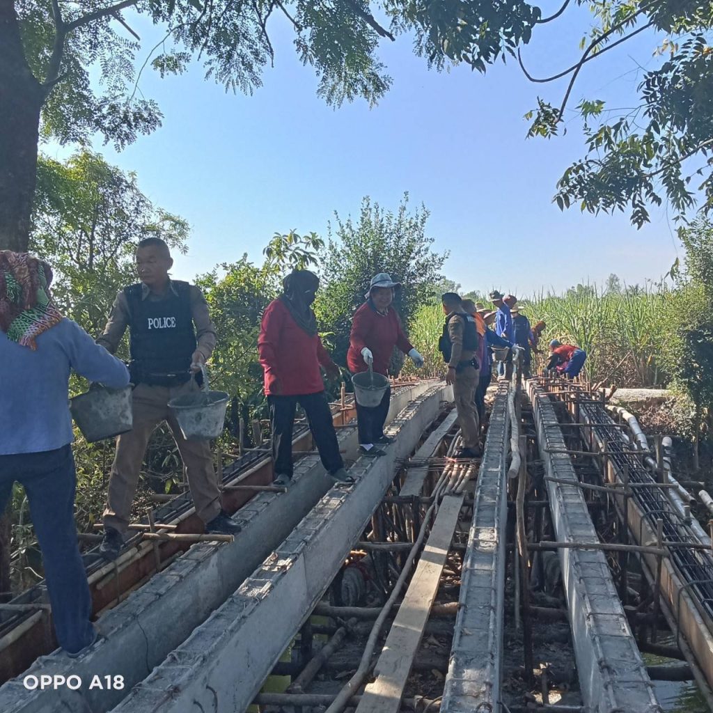 กิจกรรมจิตอาสาพัฒนาชุมชนร่วมกับผู้นำชุมชน ประชาชนในพื้นที่ โดยดำเนินการก่อสร้างสะพานข้ามลำคลองเพื่ออำนวยความสะดวกในการสัญจรของพระสงฆ์และประชาชน