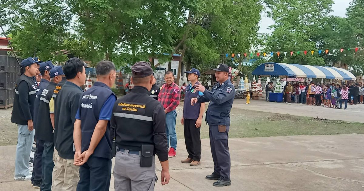 สถานีตำรวจชุมชนวังปลาป้อม □สภ.นาวัง วันนี้ 7 มี.ค.2568 เวลา 09.45น. พ.ต.อ.ณัฐวัฒน์ วงษ์สนิทธีรา ผกก.สภ.นาวัง, พ.ต.ท.วิระสันต์ ดวงจำปา รอง ผกก. ป., พ.ต.ท.สุริยา บุญประคม สวป. มอบหมายให้ ร.ต.ต.วิชาญวิชญ์ ชุมพล รอง สว(ป.)/หัวหน้าสายตรวจตำบล ร่วมกับเจ้าหน้าที่ฝ่ายปกครอง,ผู้นำหมู่บ้าน-ชุดรักษาความปลอดภัยหมู่บ้าน(ชรบ.),ชุดปฏิบัติการ อบต.วังปลาป้อม รักษาความสงบเรียบร้อยงานบุญ(ผะเหวด)ประจำปี กลางวันมีมหรสพ หมอลำซิ่ง ณ วัดศรีสว่างประจันตเขต บ.วังปลาป้อม ม.3 ต.วังปลาป้อมฯได้รวมแถวตรวจเช็คความพร้อม/ชี้แจง แนะแนวทางผู้ปฏิบัติ แก่กำลังที่ปฏิบัติหน้าที่รักษาความสงบ