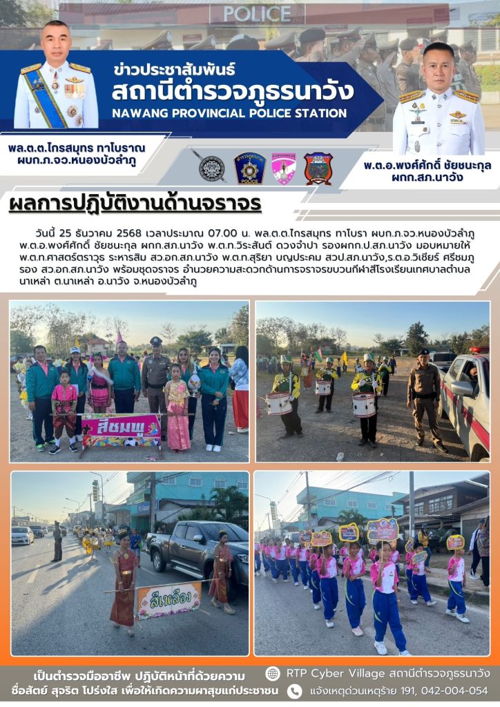 เจ้าหน้าที่ตำรวจจราจร สภ.นาวังออกปฏิบัติหน้าที่อำนวยความสะดวกด้านการจราจรกีฬาสี โรงเรียนเทศบาลตำบลนาเหล่า 25 ธันวาคม 2025 โดย admin / ข่าวประชาสัมพันธ์,ข่าวกิจกรรม,ข่าวประชาสัมพันธ์,ข่าวกิจกรรม,ข่าวกิจกรรม ธ.ค.68,ข่าวประชาสัมพันธ์,ไม่มีหมวดหมู่ สภ.นาวัง วันที่ 25 ธันวาคม 2568 เวลา07:00 น.โดยการอำนวยการของ ♦️พล.ต.ต.ไกรสมุทร ทาโบราณ ผบก.ภ.จว.หนองบัวลำภู♦️พ.ต.อ.พรพิชิต สุปัญญา รอง ผบก.ภ.จว.หนองบัวลำภู พ.ต.อ.พงศ์ศักดิ์ ชัยชนะกุล ผกก.สภ.นาวัง พ.ต.ท.วิระสันต์ ดวงจำปา รอง ผกก.ป.สภ.นาวังพ.ต.ท.รัช เบ้าสวัสติชัย รอง ผกก.สส.สภ.นาวัง พ.ต.ท.สุริยา บุญประคม สวป.สภ.นาวังมอบหมายให้ เจ้าหน้าที่ตำรวจจราจร สภ.นาวังออกปฏิบัติหน้าที่ออกตรวจพื้นที่รับผิดชอบ จุดเสี่ยง จุดล่อแหลม จุดบริการประชาชนและอำนวยความสะดวกด้านการจราจรกีฬาสี โรงเรียนเทศบาลตำบลนาเหล่า ตำบล.นาเหล่า อ.นาวัง จ.หนองบัวลำภูจำนวนผู้เข้าร่วมกิจกรรม 70-80 คนณ โรงเรียนเทศบาลตำบลนาเหล่า ต.นาเหล่า อ.นาวัง จ.หนองบัวลำภู