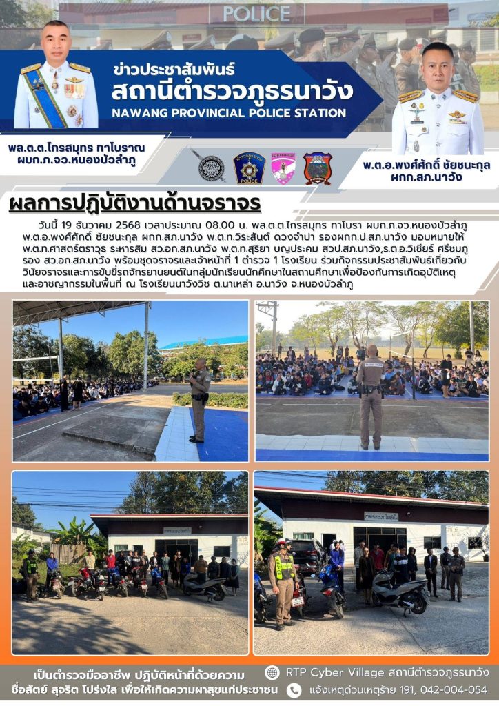 เจ้าหน้าที่ตำรวจจราจร สภ.นาวังออกประชาสัมพันธ์เกี่ยวกับวินัยจราจร การขับขี่รถจักรยานยนต์ในกลุ่มนักเรียน นักศึกษา และปรับปรุงแก้ไขท่อรถจักรยานยนต์เสียงดัง
